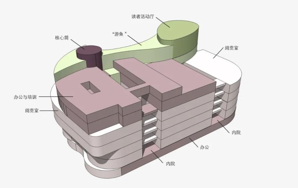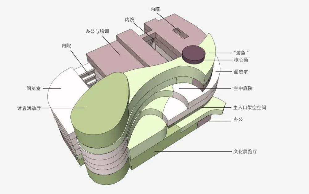 泉州圖書館作為文化中心建筑群的成員,在建筑形態(tài)、外部空間、流線組織等方面都需要與其它建筑緊密配合。出群的意蘊而成輪廓,隱含有團云的形狀。一葉形玻璃體鑲嵌在圖書館西北角,與其它三個建筑相呼應(yīng)。以此玻璃體為起點,一尾游魚在云霧中搖曳,攪動空間,辟出了外面的一庭三院一入口,安置了內(nèi)部三廳十二室及其他功能,讓這團云不再混沌,歸于井井有條。