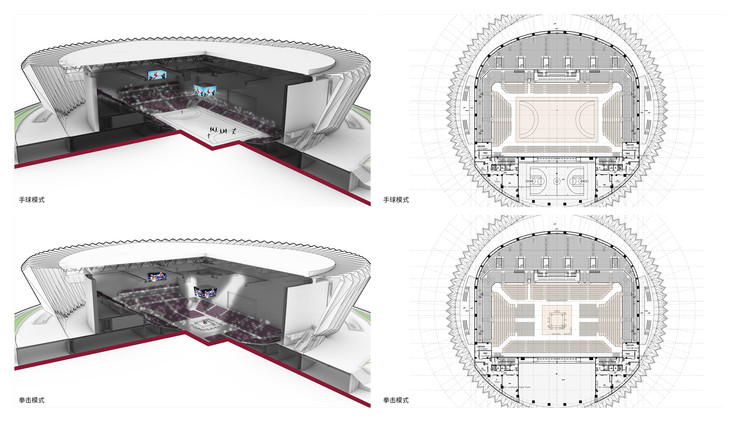 設(shè)計(jì)功能時(shí),比賽館與訓(xùn)練館并列布置,比賽館內(nèi)固定的看臺(tái)采用 U型三面布置,活動(dòng)看臺(tái)圍合競(jìng)賽場(chǎng)地四面布置?;顒?dòng)分隔賽與訓(xùn)練館之間。賽會(huì)館、訓(xùn)練館分別承擔(dān)比賽和準(zhǔn)備活動(dòng)。轉(zhuǎn)化成表演方式后,訓(xùn)練館可作為文藝表演功能的舞臺(tái)。