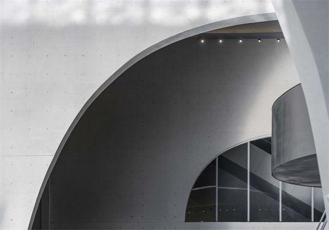 結(jié)構(gòu)的對(duì)偶運(yùn)用,在平面組織上采用橫向與縱向交織的拱形剪力墻形成有效的雙向抗震結(jié)構(gòu)體系,在剖面組織上上部屋面采用預(yù)應(yīng)力混凝土懸垂板+端部混凝土“唐瓦當(dāng)”與下部基座的拱形剪力墻共同組成閉合的剪力墻傳力體系。平面對(duì)偶的結(jié)構(gòu)特征通過大模板的清水混凝土澆筑形成清晰的室內(nèi)空間架構(gòu),而剖面對(duì)偶的結(jié)構(gòu)關(guān)系則通過陶瓷和青磚的材料組合賦予特定的歷史記憶和文化內(nèi)涵。