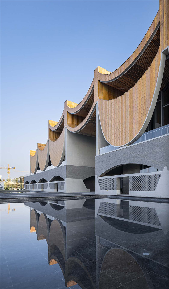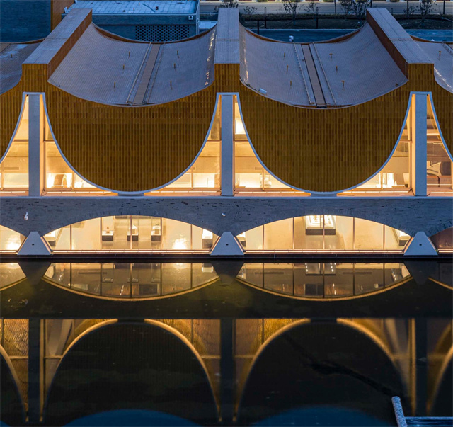 隋唐時(shí)代是我國(guó)古代技術(shù)發(fā)展的一個(gè)高峰期,跨越洛河而規(guī)模宏大的洛陽(yáng)都城規(guī)劃,明堂、天堂、龍門石窟等體量巨大的土木工程以及大運(yùn)河的開鑿都集中出現(xiàn)在這一時(shí)期。所以,我們抓住隋唐大運(yùn)河這一古代水利工程的技術(shù)特征,以洛河上架設(shè)的拱橋結(jié)構(gòu)為原型,用現(xiàn)代建造技術(shù)的自然呈現(xiàn)來取代對(duì)傳統(tǒng)風(fēng)格的具象模仿,從而實(shí)現(xiàn)古今文明的對(duì)話。