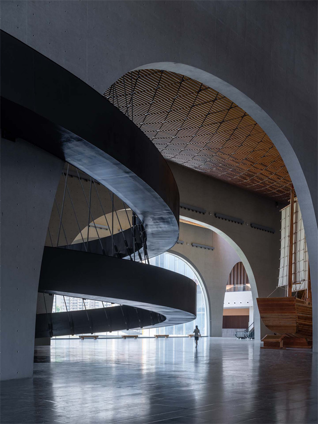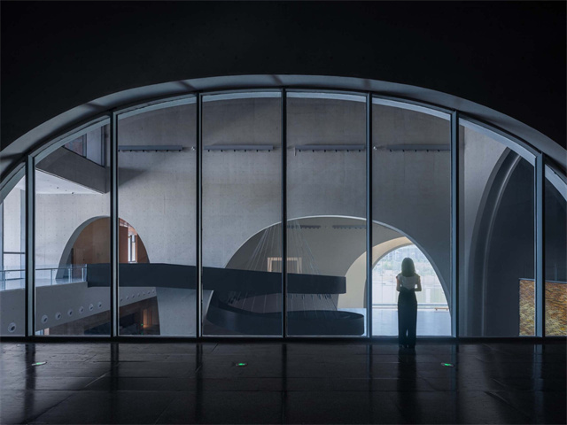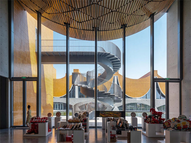 展陳空間的布局突破傳統(tǒng)博物館的封閉展陳模式,除了對(duì)溫濕度影響敏感的展品之外,大部分展廳采取開放格局,與公共空間和公園景觀融為一體。功能組織上特別強(qiáng)化南面向洛河開放的公共會(huì)議區(qū),以及北面向大運(yùn)河公園開放的文創(chuàng)展示和教育體驗(yàn)區(qū),使博物館成為名副其實(shí)的城市客廳。