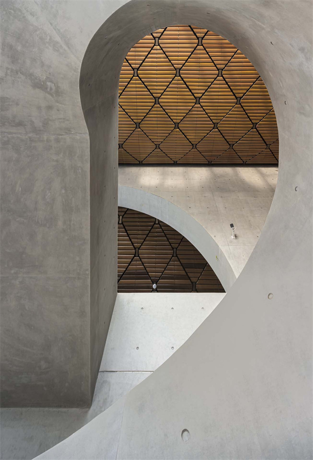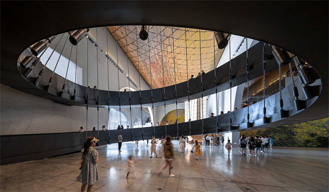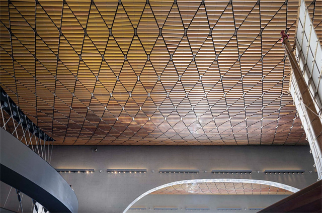 建筑主材的選用強(qiáng)調(diào)在地性的原則,即“洛陽(yáng)造”。室內(nèi)外大量采用改良后的洛陽(yáng)三彩陶瓷掛板飾面,較好地緩解了清水混凝土建筑易給人帶來的疏離感以及內(nèi)部空間聲學(xué)方面的缺陷,其中的吊頂《云帆》由126986個(gè)三彩陶瓷單元組成了迄今世界最大的陶瓷吊頂藝術(shù)作品。我們?cè)谠O(shè)計(jì)過程中與洛陽(yáng)當(dāng)?shù)氐墓に嚸佬g(shù)家郭愛和、高水旺反復(fù)討論試樣,把傳統(tǒng)手工陶藝與現(xiàn)代設(shè)計(jì)、加工技藝相結(jié)合,助推洛陽(yáng)傳統(tǒng)陶瓷產(chǎn)業(yè)的創(chuàng)新發(fā)展。