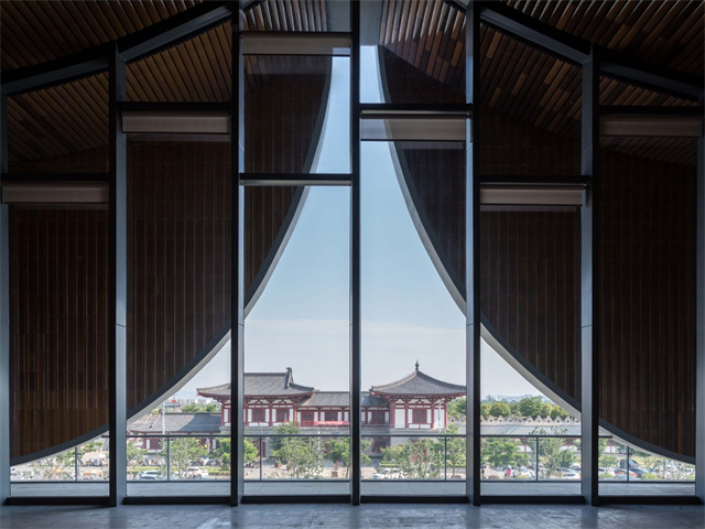 建筑風(fēng)格方面,博物館所在的隋唐大運(yùn)河國(guó)家文化公園正處于隋唐洛陽(yáng)城遺址的范圍,周邊規(guī)劃了大量的仿唐風(fēng)格景觀建筑。按慣常思路,這座運(yùn)河博物館必是唐風(fēng)建筑無(wú)疑。我們的設(shè)計(jì)試圖跳脫出仿唐風(fēng)格的包圍和束縛,尋找對(duì)隋唐歷史文化的不同切入視角。