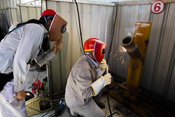 7月18日,在簡(jiǎn)短的啟動(dòng)儀式后,活動(dòng)正式進(jìn)入實(shí)際操作的比拼。率先登場(chǎng)的是電焊工,記者在位于白鶴灘壓力鋼管廠的比武現(xiàn)場(chǎng)看到,參賽選手們頭戴防護(hù)罩,手持電焊