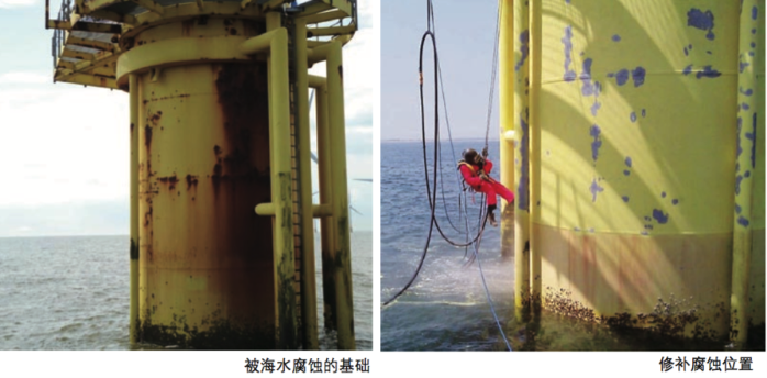 避免腐蝕的另一種常用方法是在鋼結(jié)構(gòu)表面施以由環(huán)氧樹(shù)脂構(gòu)成的防腐涂層來(lái)隔絕海水。目前,海上風(fēng)電的防腐常將這兩種方法結(jié)合起來(lái),在涂料中加入大量鋅粉或鋁粉,成為犧牲陽(yáng)極。一旦涂層的阻隔作用削弱,就用犧牲陽(yáng)極來(lái)保護(hù)。
