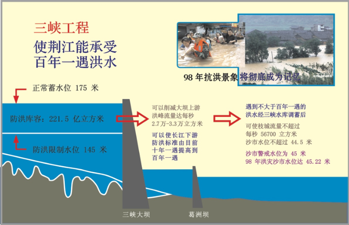 如果沒(méi)有三峽工程,荊江河段若遭遇類似歷史上出現(xiàn)過(guò)的1860、1870年特大洪水,兩岸堤防將潰決,洪水直趨洞庭湖,淹沒(méi)江漢平原,直接危及武漢市和京廣鐵路的安全,沖毀沿線鄉(xiāng)村、城鎮(zhèn)和工礦企業(yè),勢(shì)必造成大量人員傷亡和巨大經(jīng)濟(jì)損失。為了消除中華民族的心腹大患,因此將防洪功能作為三峽工程的首要功能。