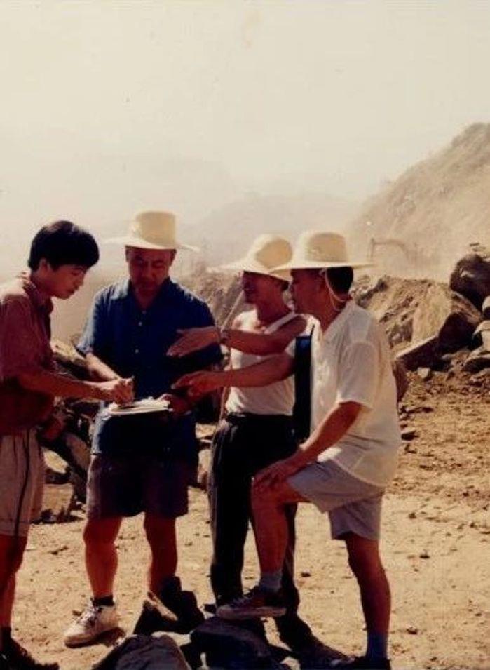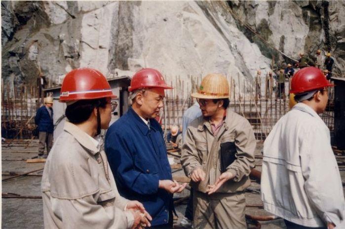 1994年,導(dǎo)流明渠右邊坡設(shè)計(jì),鄭守仁(左二)與地質(zhì)人員在現(xiàn)場(chǎng)研究危巖體處理