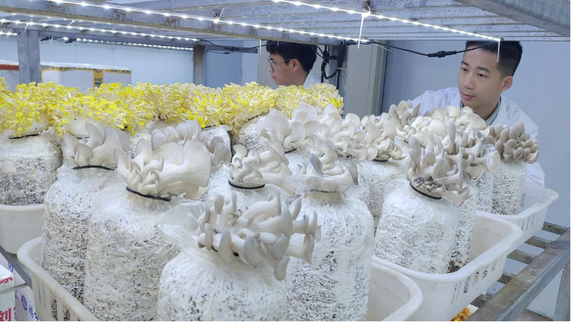 ▲ 技術(shù)人員在大棚培育菌菇新品種 石富村村委會(huì)供圖