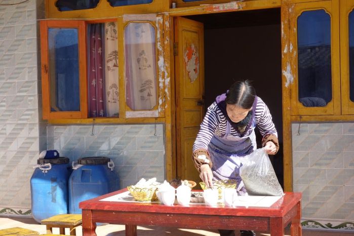 迪姑村民小組依靠鄉(xiāng)村旅游脫貧致富的普米族很多,普米族婦女熊文玉就是其中之一。熊文玉家有5口人,現(xiàn)在她家的鄉(xiāng)村旅游生意很紅火。熊文玉不無自豪地說:“前天,我們家來了3名廣東的自駕游客,住了3天,住普米特色民居,吃本地的土雞、黑谷、木耳等特色食品,白天觀賞攀天閣壩子風(fēng)光,晚上欣賞普米民歌,他們玩得非常開心,走時(shí)留下1600元,還買了2000多元的黑谷和天麻。”