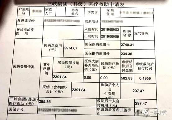 受助患者醫(yī)療報銷單據(jù)中的三峽集團(tuán)(縣級)醫(yī)療救助申請表