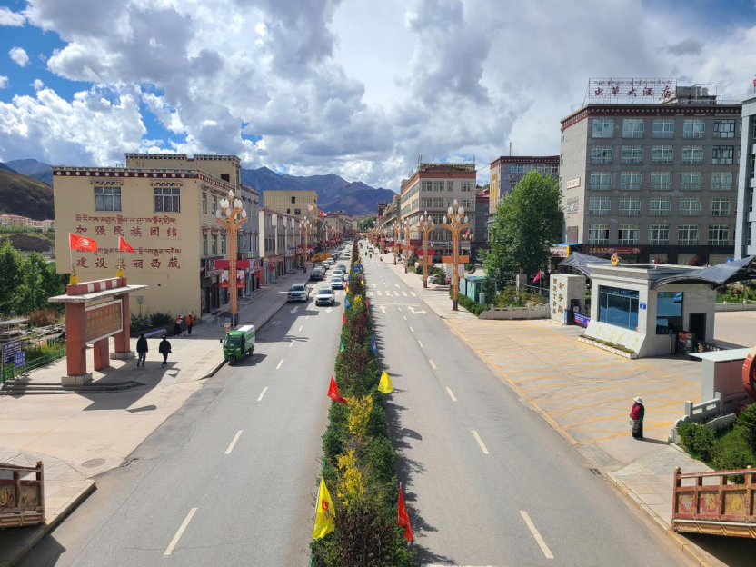 走在丁青縣城,整潔的街道兩旁花草相映。