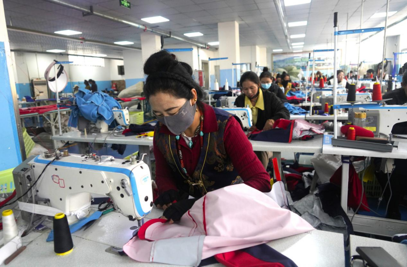 ▲廠房內(nèi)藏族女工正在進(jìn)行校服加工 ?攝影:劉艾菁