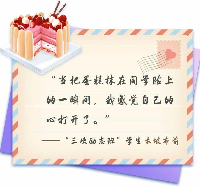 這是木坡布前十三年來(lái)過(guò)的第一個(gè)生日?!巴瑢W(xué)們都特別開(kāi)心,鬧成一團(tuán),還用手指頭蘸上蛋糕上的奶油互相在臉上涂抹,” 木坡布前對(duì)那一天的場(chǎng)景記憶猶新,“我也被歡樂(lè)的氣氛感染了,學(xué)著同學(xué)們的樣子,我也把奶油抹到了同學(xué)臉上,那一瞬間,我感覺(jué)我和同學(xué)們的距離一下子拉近了?!钡谝淮芜^(guò)生日,第一次游學(xué),第一次演講……木坡布前在“三峽勵(lì)志班”遇到了很多個(gè)人生“第一次”,漸漸打開(kāi)了曾經(jīng)封閉的心靈。課堂上,他舉手發(fā)言的次數(shù)多了起來(lái);小組中,他參與討論的聲音也高了起來(lái)。以前,一道不會(huì)的數(shù)學(xué)題,木坡布前要花上幾個(gè)小時(shí)的時(shí)間自己想,現(xiàn)在他會(huì)主動(dòng)尋求老師和同學(xué)的幫助,很快就弄明白了。