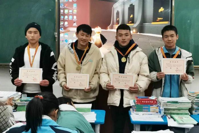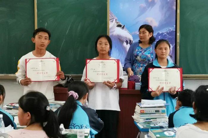 ▲?木坡布前(左一)在教室講臺(tái)領(lǐng)獎(jiǎng)狀