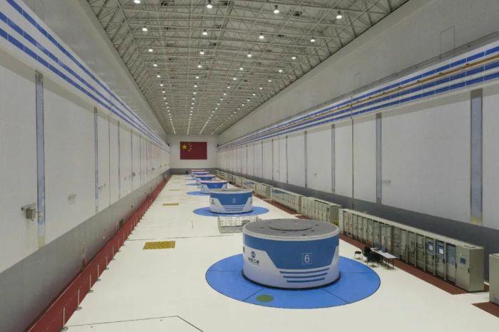 長(zhǎng)龍山電站坐落在群山之間,沿進(jìn)廠交通洞向山體內(nèi)行進(jìn)1.2公里,來(lái)到長(zhǎng)龍山電站的廠房。232米長(zhǎng)的廠房?jī)?nèi),6臺(tái)35萬(wàn)千瓦的機(jī)組一字排開(kāi),其中4臺(tái)機(jī)組上方亮起一圈紅色燈光,通過(guò)機(jī)頂罩的小窗口可以看到飛速旋轉(zhuǎn)的轉(zhuǎn)子。