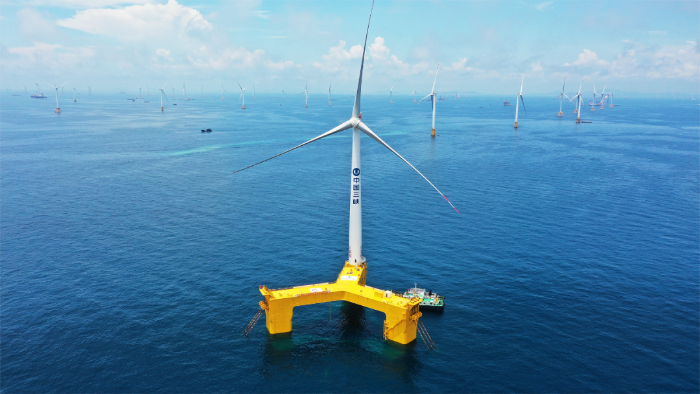 ▲我國首個漂浮式海上風電平臺,搭載全球首臺抗臺風型漂浮式海上風電機組,組成“三峽引領(lǐng)號”,在廣東陽江海上風電場成功并網(wǎng)發(fā)電(三峽能源供圖)