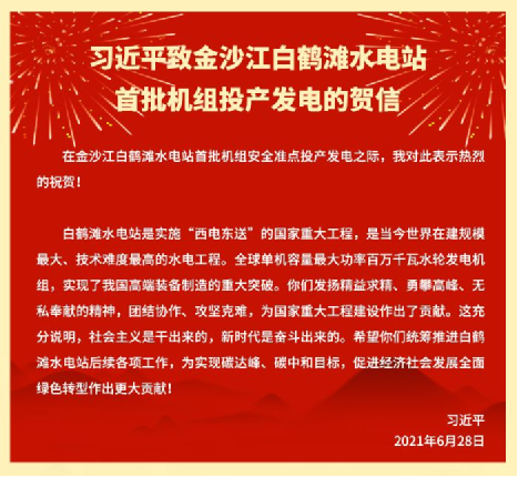 習(xí)近平致信祝賀金沙江白鶴灘水電站首批機組投產(chǎn)發(fā)電