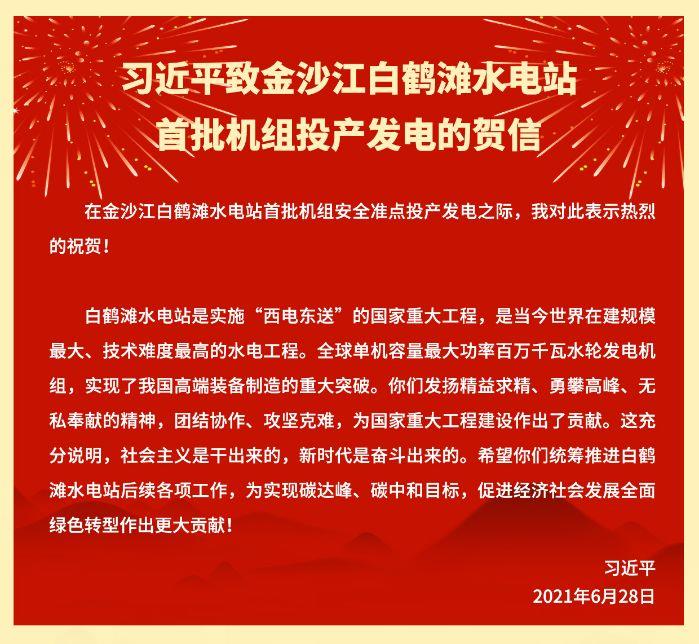 新華社北京6月28日電 金沙江白鶴灘水電站首批機組于28日安全準點投產(chǎn)發(fā)電。中共中央總書記、國家主席、中央軍委主席習(xí)近平發(fā)來賀信,表示熱烈的祝賀。