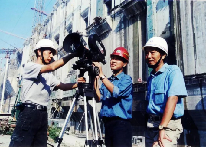 ▲?李忠和同事們?cè)谌龒{工程建設(shè)現(xiàn)場(chǎng)拍攝 湖北電影制片廠供圖