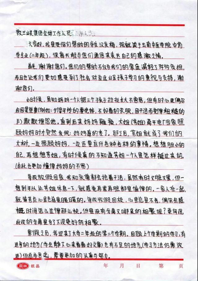 2017年2月24日,還在就讀云南中醫(yī)學(xué)院中藥專業(yè)的她,給三峽集團(tuán)寄來了一封感謝信,言辭語句中表達(dá)著對三峽集團(tuán)幫助的感激和對未來生活的向往。其中一段“大山里的孩子,雖沒有碰過城里人玩過的東西,沒嘗過城里人吃過的東西,但他們?nèi)杂凶约旱目鞓?,總能把微笑掛在臉上,仿佛自己是這世上最幸福的人”最令人動容。