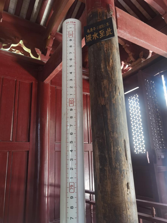 1985年黃陵廟啟動(dòng)修繕工作,水利部長(zhǎng)江水利委員會(huì)復(fù)核后認(rèn)定立柱上保留的洪水痕跡與1870年最高水位水平一致,便留下黃陵廟禹王殿內(nèi)東北角兩根立柱不刷油漆,作為重要水文文物標(biāo)志予以保存。今天,當(dāng)我們走進(jìn)禹王殿時(shí),還能看到一百五十多年前的洪水痕跡,下面一塊木牌上寫著“老庚午(1870)年洪水至此”。