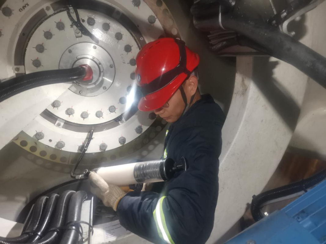 ▲?運(yùn)維員對(duì)機(jī)組偏航系統(tǒng)注入潤(rùn)滑油