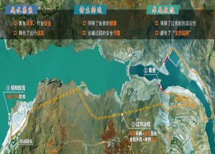 金沙江下游山高谷深,河道狹窄,采用傳統(tǒng)高壩過魚設(shè)施技術(shù)難度大、安全風險高。對此,烏東德水電站創(chuàng)新提出了“尾水集魚、仿生轉(zhuǎn)運、動水放流、智能監(jiān)控”的全過程協(xié)同過魚理念,建成國內(nèi)首創(chuàng)的300米級特高拱壩集運魚系統(tǒng)。